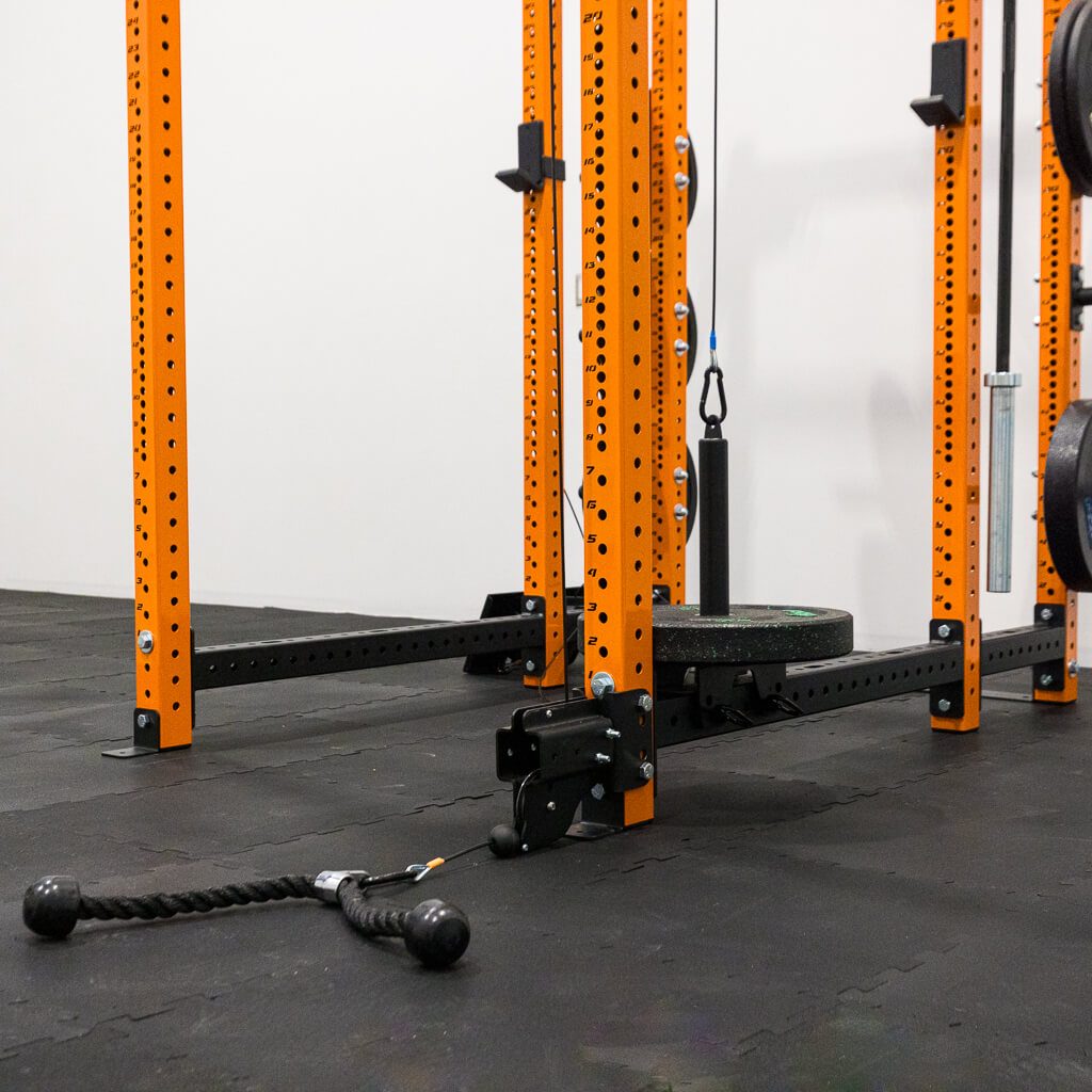 The Build Limitless® Ripcord pulley system is a reliable and useful addition to any gym. It comes in two lengths to be compatible with both 95" and 81" rack heights and is designed to be multi-directional. The Ripcord can be mounted both in-line with, and across the existing crossmembers of your rack. We've included a weight platform that attaches directly to your rack when using Ripcord inline with crossmembers or placed on the floor when using it across the crossmembers. This prevents unnecessary wear and tear to your rack, floor, and weights, while also providing a stable landing pad for your weight post.