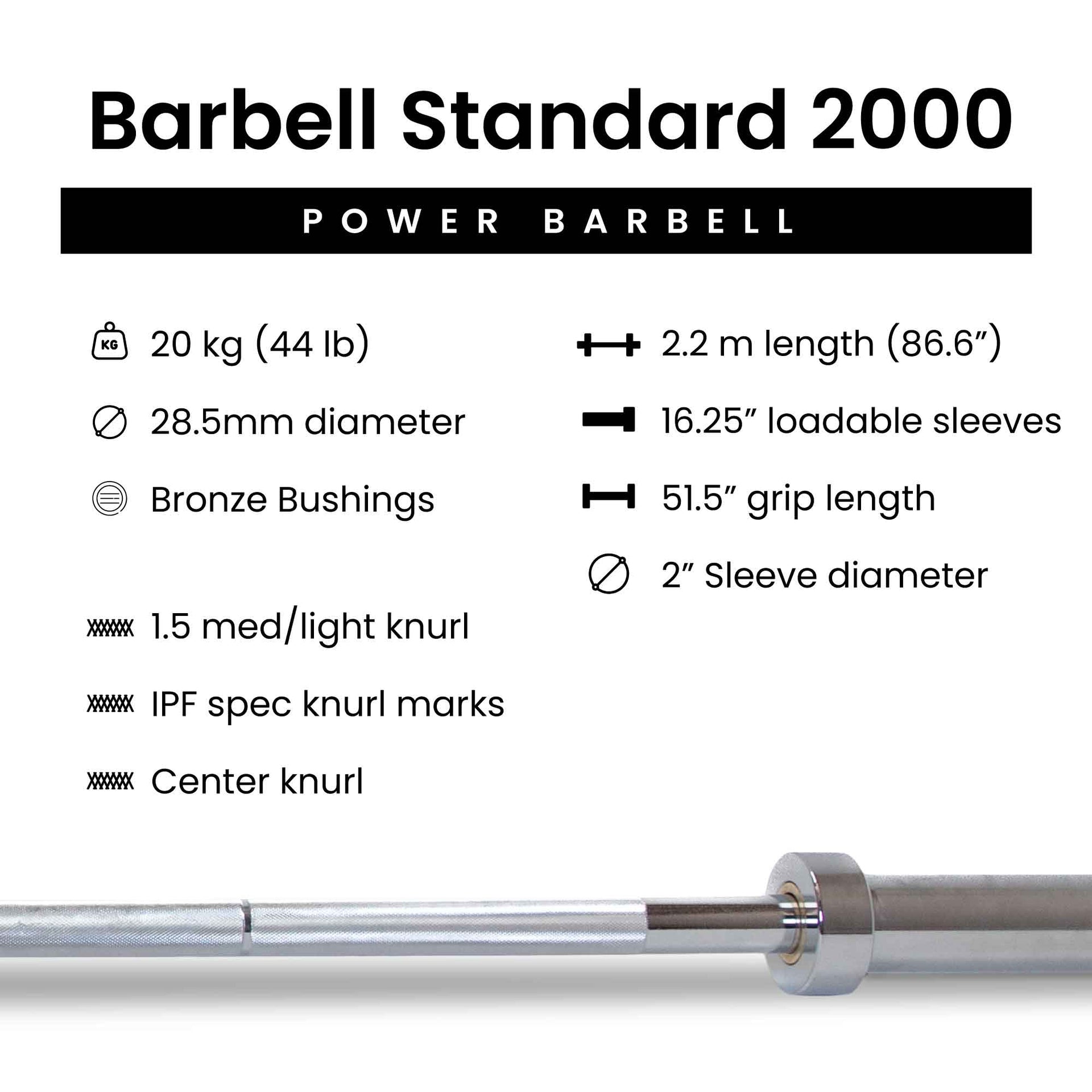 The Barbell Standard 2000 is engineered for powerlifting with IPF knurl marks, a sturdy 206,000 PSI tensile strength for extreme durability, integrated bronze bushings and precision knurling for the perfect balance of control, grip and comfort. The Barbell 2000 is ideal for squats, bench, deadlift, and any heavy lifting.