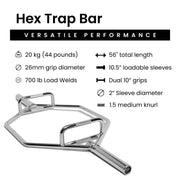 The Barbell Standard Hex Bar (aka Trap Bar, same thing with a different name) improves deadlift form and adds versatility to your workout routine. The hex bar design allows you to keep the weight aligned with your center of gravity, reducing the load on your lower back during deadlifts and unlocking new exercises in your gym. Forged from 188,000 PSI steel with a 1.5 medium knurl and two sets of grip options, the Barbell Standard Hex Bar is built for safety, reliability, and versatility.