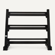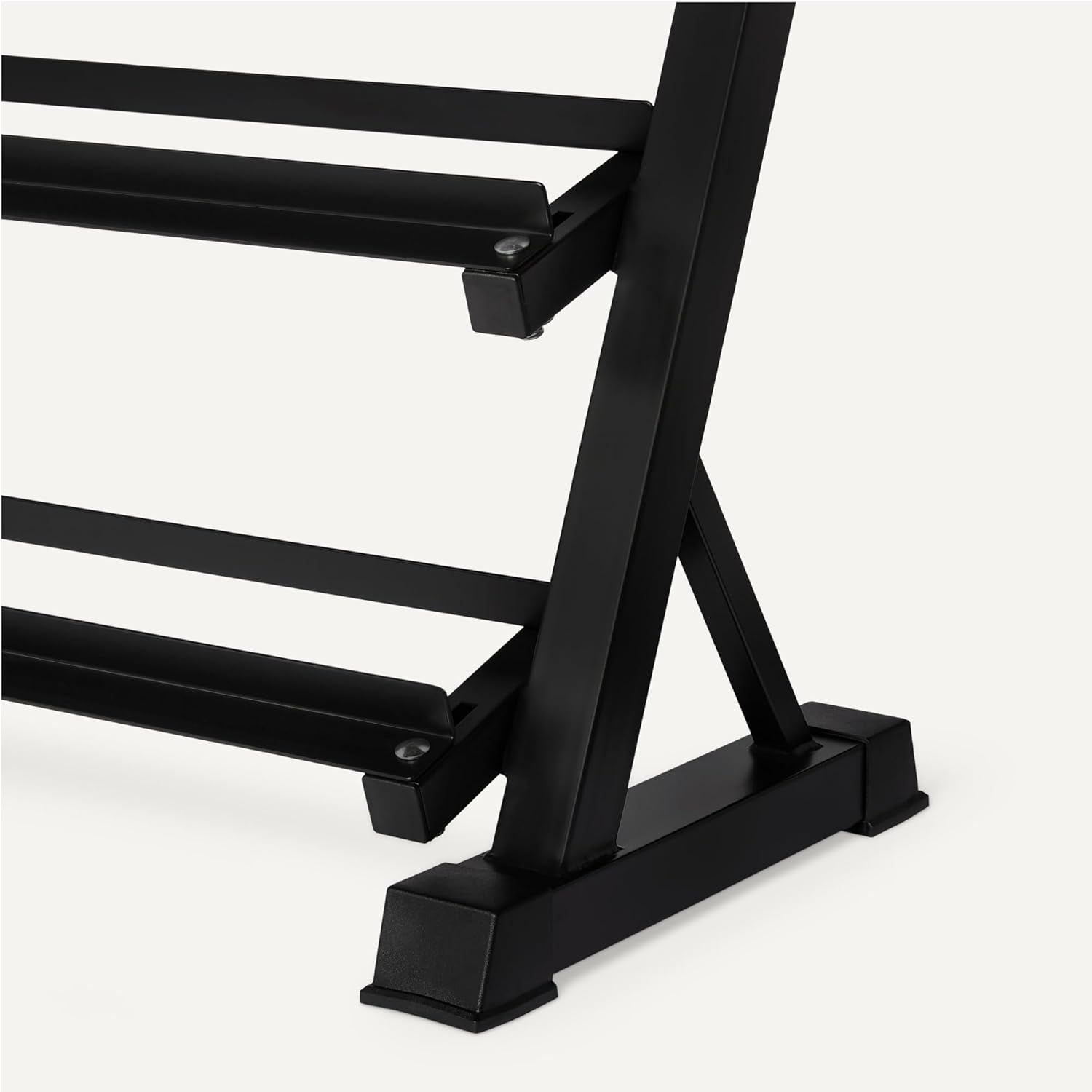 Keep your dumbbells organized and off the ground. This rugged, multi-level weight rack puts rubber, cast iron, urethane, and neoprene dumbbells at the perfect height for quick, easy access. With 3 sturdy tiers, it handles up to 1000 LB and fits dumbbells from 5 LB to 50 LB. Designed with heavy-duty 70-degree angled rails, this shelf delivers easy access to your gear and stays solid under a full load. 1" plate lips guide your dumbbells back in place when re-racking and keep them in place when not in use.