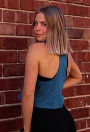 Features: Sideseamed. Relaxed, cropped fit. Racerback. Raw edge arm holes.