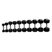 Workout with dumbbells to increase your range of motion and stay injury free while building size and strength. Six-sided and rubber coated, PRx Rubber Hex Dumbbells will have low impact on your floor and won't roll around once you set them down.