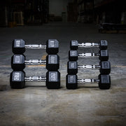 The Heavy Set includes pairs of 55lb, 60lb, 65lb, 70lb, 80lb, 90lb and 100lb dumbbells.